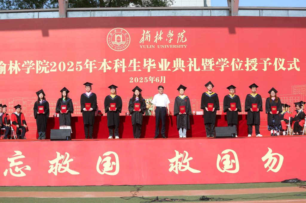 毕业典礼在雄壮嘹亮的国歌声中拉开序幕。副校长张晓宣读毕业及学位授予情况,学位委员会主席康伟校长为54名学位获得者代表逐一颁发证书并拨流苏,现场掌声此起彼伏,见证这一荣耀瞬间。党委副书记马亚军宣读122名“校级优秀本科毕业生”名单,副校长姚学慧宣读87名“校级优秀学生干部”名单,校领导为获奖代表颁发荣誉证书。典礼特别设置感恩环节,毕业生代表向公寓、安保、餐饮等一线工作人员献花,致谢他们在校园生活中润物无声的守护与付出,传递出榆苑学子的感恩之心。